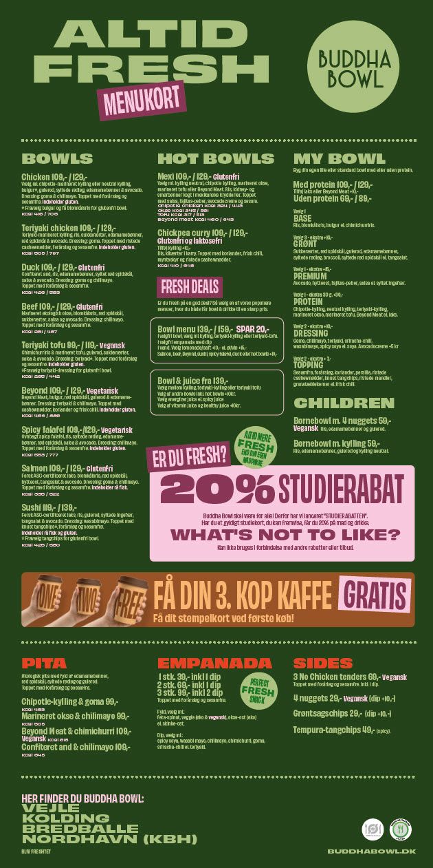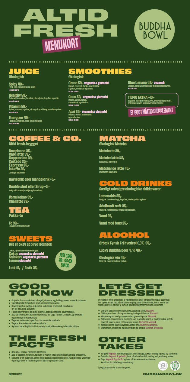 ALTID FRESH betyder, at alt laves fra bunden, at råvarerne er crisp og vi altid arbejder med 60–90 % økologi. Det er din garanti for et måltid, der leverer mere end bare mæthed – og føles bedre end den sædvanlige takeaway-løsning.